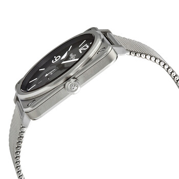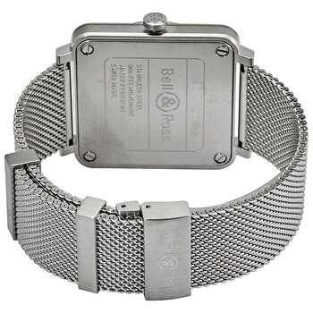 Stainless steel case with a stainless steel milanese mesh bracelet. Fixed stainless steel bezel. Black dial with luminous hands and index hour markers. Arabic numerals mark the 3, 9 and 12 o'clock positions. Dial Type: Analog. Luminescent hands. Date display between the 4 and 5 o'clock positions. Small seconds sub-dial. Bell and Ross calibre BR-CAL.102 quartz movement. Scratch resistant sapphire crystal. Pull / push crown. Solid case back. Square case shape. Case dimensions: 39 mm x 39 mm. Slip through clasp. Water resistant at 100 meters / 330 feet. Functions: date, hour, minute, second. Casual watch style. Watch label: Swiss Made. Bell and Ross Quartz Black Dial Men's Watch BRS-BLC-ST/SST.