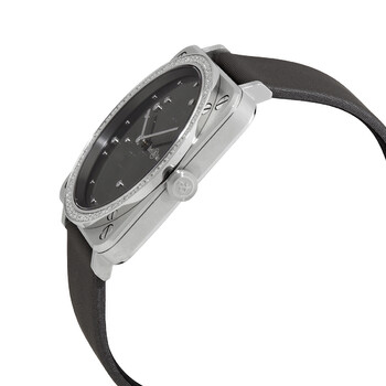 Satin-polished steel case with a grey satin (calfskin leather backed) strap. Fixed stainless steel bezel set with 66 white diamonds. Grey sunray (diamond-set) dial with silver-tone hands and dot hour markers. Dial Type: Analog. Bell and Ross calibre BR-CAL.102 quartz movement. Scratch resistant sapphire crystal. Pull / push crown. Solid case back. Square case shape, Case size: 39 mm x 39 mm. Tang clasp. Water resistant at 100 meters / 330 feet. Functions: hour, minute. Additional Info: bezel set with white diamonds (66 stones totalling 0.99 ct). Luxury watch style. Watch label: Swiss Made. Bell and Ross Quartz Grey Sunray Dial Unisex Watch BRS-ERU-ST-LGD/SCA.