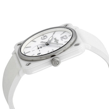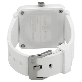 White ceramic case with a white rubber strap. Fixed bezel. White dial with silver-tone hands and index-Arabic numerals hour markers. Dial Type: Analog. Date display between 4 and 5 o'clock position. One- small seconds subdials. Quartz movement. Scratch resistant sapphire crystal. Solid case back. Square case shape. Case size: 39 mm. Water resistant at 100 meters / 330 feet. Functions: hour, minute, second. Watch label: Swiss Made. Bell and Ross Quartz White Dial Men's Watch BRS-WH-CES/SCA.