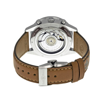 Stainless steel case with a tan leather strap. Fixed stainless steel bezel with a black top ring. Black dial with luminous gold-toned hands and index hour markers. Arabic numerals mark the 6 and 12 o'clock positions. Minute markers around the outer rim. Dial Type: Analog. Luminescent hands and markers. Date display between 4 and 5 o'clock positions. Two sub-dials displaying: 60 second and 24 hour (GMT). Automatic movement. Scratch resistant sapphire crystal. Skeleton case back. Case diameter: 43 mm. Round case shape. Deployment clasp. Water resistant at 100 meters / 330 feet. Functions: chronograph, tachymeter, date, hour, minute, second. Luxury watch style. Watch label: Swiss Made. Item Variations: BRV126 FLYBACK, BRV126.FLYBACK, BRV126FLYBACK. Bell and Ross Sport Heritage Flyback Automatic Black Dial Tan Leather Men's Watch BRV126-FLYBACK.
