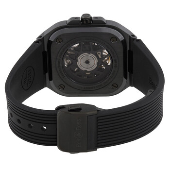 Black ceramic case with a black rubber strap. Fixed black ceramic bezel. Transparent dial with luminous black hands and index hour markers. Dial Type: Analog. Luminescent hands and markers. Automatic movement with a 54-hour power reserve. Scratch resistant sapphire crystal. Screw down crown. Transparent see through case back. Cushion case shape, case size: 41 mm. Folding clasp. Water resistant at 100 meters / 330 feet. Urban Series. Sport watch style. Watch label: Swiss Made. Bell and Ross Urban Automatic Men's Watch BR05A-BL-SK-CE/SRB.