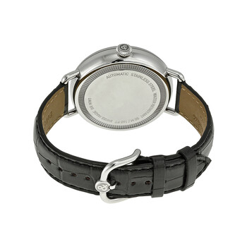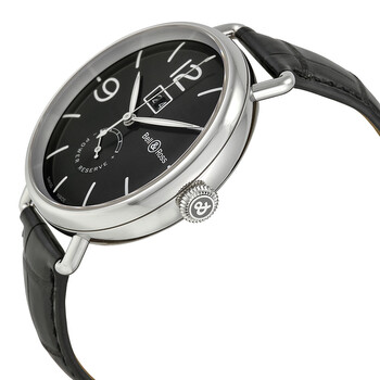 Stainless steel case with a black leather strap. Fixed stainless steel bezel. Black dial with silver-tone hands and index hour markers. Arabic numerals mark the 3, 9 and 12 o'clock positions. Dial Type: Analog. Luminescent hands and markers. Power reserve sub-dial at the 7 o'clock position. Automatic movement. Scratch resistant sapphire crystal. Case size: 45 mm. Case thickness: 7 mm. Round case shape. Band width: 20 mm. Band length: 8 inches. Tang clasp. Water resistant at 50 meters / 165 feet. Functions: date, hour, minute, second. Luxury watch style. Watch label: Swiss Made. Bell and Ross Vintage Automatic Black Dial Black Leather Men's Watch BLRBRWW190-BL-ST.