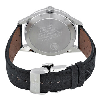 Stainless steel case with a black leather strap. Fixed stainless steel bezel. Black dial with luminous silver-tone hands and index hour markers. Arabic numerals mark the 3, 9 and 12 o'clock positions. minute markers around the outer rim. Dial Type: Analog. Luminescent hands and markers. Date display between the 4 and 5 o'clock positions. Small seconds sub-dial above the 6 o'clock position. Bell and Ross calibre BR-CAL.305 automatic movement with a 42-hour power reserve. Scratch resistant sapphire crystal. Solid case back. Round case shape. Case size: 42 mm. Deployment clasp. Water resistant at 100 meters / 330 feet. Functions: date, hour, minute, second. Dress watch style. Watch label: Swiss Made. Bell and Ross Vintage Automatic Black Dial Men's Watch BRV123-BS-ST/SF.