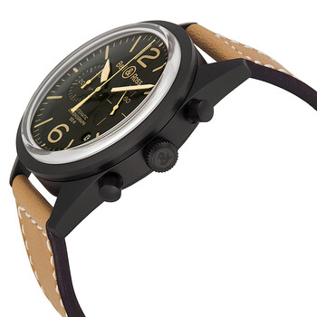 Black PVD stainless steel case with a beige leather strap. Fixed black PVD bezel. Black dial with beige hands and index hour markers. Arabic numerals mark the 6 and 12 o'clock positions. Minute markers around the outer rim. Dial Type: Analog. Luminescent hands and markers. Date display between the 4 and 5 o'clock positions. Chronograph - two sub-dials displaying: 60 second and 30 minute. Automatic movement with a 40-hour power reserve. Scratch resistant sapphire crystal. Pull / push crown. Solid case back. Case diameter: 41 mm. Case thickness: 14 mm. Round case shape. Tang clasp. Water resistant at 100 meters / 330 feet. Functions: chronograph, date, hour, minute, second. Luxury watch style. Watch label: Swiss Made. Bell and Ross Vintage Watch BRV126-HERITAGE.
