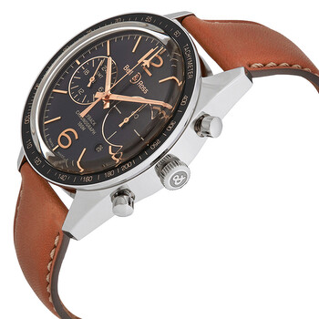Stainless steel case with a brown leather strap. Fixed stainless steel bezel with a black aluminium inlay. Black dial with luminous rose gold-tone hands and index hour markers. Arabic numerals mark the 6 and 12 o'clock positions. Minute markers around the outer rim. Dial Type: Analog. Luminescent hands. Date display between the 4 and 5 o'clock positions. Two sub-dials displaying: 60 seconds, and 24 hours. Bell and Ross calibre BR-CAL.301 automatic movement with a 42-hour power reserve. Scratch resistant sapphire crystal. Screw down crown. Transparent case back. Round case shape. Case size: 43 mm. Case thickness: 15 mm. Band width: 22 mm. Fold over clasp with a push button release. Water resistant at 100 meters / 330 feet. Functions: GMT & flyback, second time zone, hour, minute, second. Additional Info: limited edition of 500 pieces. Luxury watch style. Watch label: Swiss Made. Bell and Ross Vintage Automatic Chronograph GMT Flyback Men's Watch BRV126-FLY-GMT/SCA.