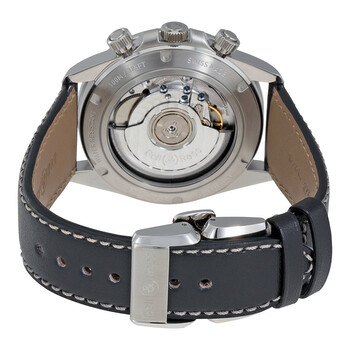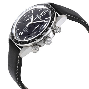 Silver-tone stainless steel case with a black leather strap. Fixed silver-tone stainless steel bezel with a black aluminium top ring showing tachymeter markings. Black dial with luminous silver-tone hands and index hour markers. Arabic numerals mark the 6 and 12 o'clock positions. minute markers around the outer rim. Dial Type: Analog. Luminescent hands and markers. Date display between 4 and 5 o'clock position. Chronograph - two sub-dials displaying: 60 second and 30 minute. Bell and Ross Calibre BR-CAL.301 Automatic movement, based upon ETA 2894-2, containing 37 Jewels, bitting at 28800 vph, and has a power reserve of approximately 42 hours. Scratch resistant sapphire crystal. Transparent case back. Round case shape, case size: 41 mm, case thickness: 15.25 mm. Band width: 22 mm. Fold over with push button release clasp. Water resistant at 100 meters / 330 feet. Functions: chronograph, tachymeter, date, hour, minute, second. Vintage Series. Luxury watch style. Watch label: Swiss Made. Bell and Ross Vintage Automatic Chronograph Men's Watch BRV294-BL-ST.