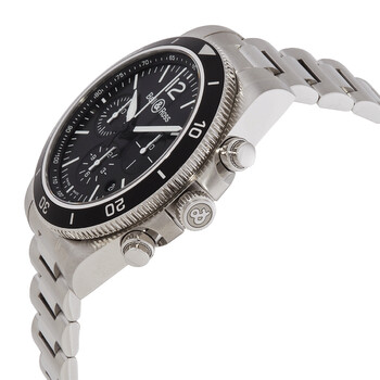 Silver-tone stainless steel case and bracelet. Bi-directional rotating black stainless steel bezel. Black dial with silver-tone hands and index-Arabic numeral hour markers. Minute markers around the outer rim. Dial Type: Analog. Luminescent hands and markers. Date display between 4 and 5 o'clock position. Chronograph - two sub-dials displaying: 60 second and 30 minute. Bell and Ross Calibre BR-CAL.301 Automatic movement, based upon ETA 2894-2, containing 37 Jewels, bitting at 28800 vph, and has a power reserve of approximately 42 hours. Anti-reflective scratch resistant sapphire crystal. Screw down crown. Transparent case back. Round case shape, case size: 43 mm. Push button folding clasp. Water resistant at 100 meters / 330 feet. Functions: chronograph, date, hour, minute, small second. Vintage Series. Sport watch style. Watch label: Swiss Made. Bell and Ross Vintage Chronograph Automatic Black Dial Men's Watch BRV394-BL-ST/SST.