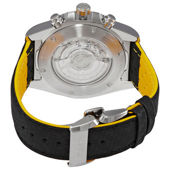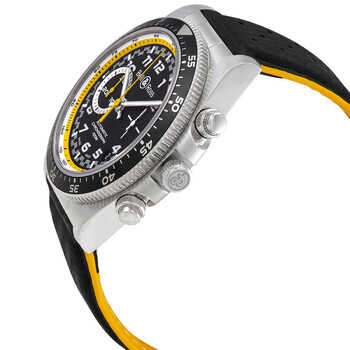 Stainless steel case with a black / yellow carbon-effect (calfskin) leather strap. Bi-directional rotating stainless steel bezel with anodised black aluminium ring with countdown timer. Matt black dial with silver-tone hands and Arabic numeral hour markers. Tachymeter scale on the flange. Dial Type: Analog. Luminescent hands and markers. Date display between 4 and 5 o'clock position. Chronograph - two sub-dials displaying: 60 second and 30 minute. Bell and Ross calibre BR-CAL.301 automatic movement, based upon ETA 2894-2, containing 37 Jewels, bitting at 28800 vph, and has a power reserve of approximately 42 hours. Scratch resistant sapphire crystal. Screw down crown. Transparent see through case back. Round case shape. Case size: 43 mm. Fold over clasp. Water resistant at 100 meters / 330 feet. Functions: chronograph, date, hour, minute, small second. Vintage Series. Luxury watch style. Watch label: Swiss Made. Bell and Ross Vintage Chronograph Automatic Black Dial Men's Watch BRV394-RS20/SCA.