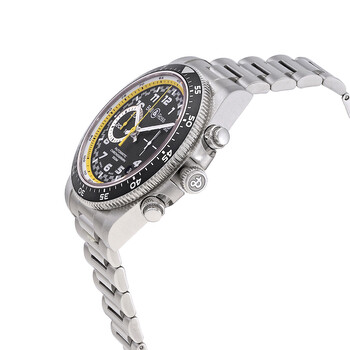 Silver-tone stainless steel case and bracelet. Bi-directional rotating silver-tone stainless steel bezel with anodised black aluminium ring with countdown timer. Matt black dial with silver-tone hands and Arabic numeral hour markers. Minute markers around the outer rim. Dial Type: Analog. Luminescent hands and markers. Date display between 4 and 5 o'clock position. Chronograph - two sub-dials displaying: small second and 30 minute. Bell and Ross Calibre BR-CAL.301 Automatic movement, based upon ETA 2894-2, containing 37 Jewels, bitting at 28800 vph, and has a power reserve of approximately 42 hours. Scratch resistant sapphire crystal. Screw down crown. Transparent see through case back. Round case shape, case size: 43 mm. Fold over clasp with a safety release. Water resistant at 100 meters / 330 feet. Functions: chronograph, date, hour, minute, small second. Vintage Series. Luxury watch style. Watch label: Swiss Made. Bell and Ross Vintage Chronograph Automatic Black Dial Men's Watch BRV394-RS20/SST.