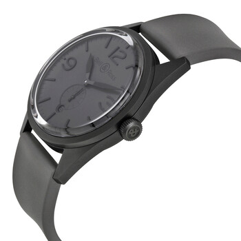 Stainless steel case with a grey rubber strap. Fixed stainless steel bezel. Grey dial with grey hands and index hour markers. Arabic numerals mark the 3, 9 and 12 o'clock positions. Dial Type: Analog. Luminescent hands and markers. Date display at the 6 o'clock position. Seconds sub-dial above the 6 o'clock position. Automatic movement. Scratch resistant sapphire crystal. Solid case back. Case diameter: 41 mm. Round case shape. Tang clasp. Water resistant at 100 meters / 330 feet. Functions: date, hour, minute, second. Luxury watch style. Bell and Ross Vintage Commando Grey Dial Men's Watch BRV123-COMMANDO.