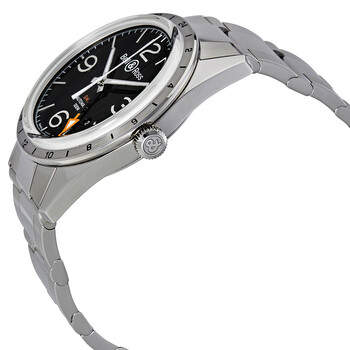 Stainless steel case with a black rubber strap. Fixed stainless steel bezel showing 24 hour (GMT) markings. Black dial with luminous silver-tone hands and index hour markers. Arabic numerals mark the 3, 6, 9 and 12 o'clock positions. Minute markers around the outer rim. Dial Type: Analog. Luminescent hands and markers. Date display between the 4 and 5 o'clock positions. Automatic movement. Scratch resistant sapphire crystal. Screw down crown. Transparent case back. Case size: 42 mm. Round case shape. Fold over clasp. Water resistant at 100 meters / 330 feet. Functions: date, hour, minute, second. Sport watch style. Watch label: Swiss Made. Bell and Ross Vintage GMT Automatic Men's Watch BRV123-BL-GMT/SST.