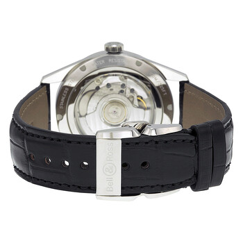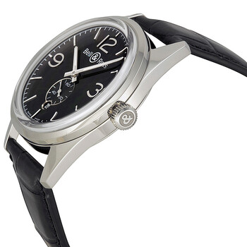 Stainless steel case with a black alligator leather strap. Fixed stainless steel bezel. Black dial with silver-tone hands and index hour markers. Arabic numerals mark the 3, 9 and 12 o'clock positions. minute markers around the outer rim. Dial Type: Analog. Luminescent hands and markers. Date display at the 6 o'clock position. Seconds sub-dial at the 6 o'clock position subdials. ETA Caliber 2895-2 automatic movement with a 42-hour power reserve. Scratch resistant sapphire crystal. Pull / push crown. Skeleton case back. Round case shape, case size: 41 mm, case thickness: 12 mm. Band width: 22 mm. Deployment clasp. Water resistant at 100 meters / 330 feet. Functions: date, hour, minute, second. Luxury watch style. Watch label: Swiss Made. Item Variations: BRG123 BL ST SCR, BRG123.BL.ST.SCR, BRG123BLSTSCR. Bell and Ross Vintage Officer Black Dial Black Leather Men's Watch BRG123-BL-ST-SCR.