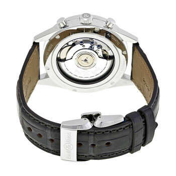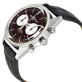 Silver-tone stainless steel case with a grey alligator leather strap. Fixed silver-tone stainless steel bezel. Brown dial with silver-tone hands and index hour markers. Minute markers around the outer rim. Dial Type: Analog. Luminescent hands and markers. Date display between the 4 and 5 o'clock positions. Chronograph - two sub-dials displaying: 60 second and 30 minute. Bell and Ross Calibre BR-CAL.301 Automatic movement, based upon ETA 2894-2, containing 37 Jewels, bitting at 28800 vph, and has a power reserve of approximately 42 hours. Scratch resistant sapphire crystal. Transparent case back. Round case shape, case size: 41 mm. Folding clasp. Water resistant at 100 meters / 330 feet. Functions: chronograph, date, hour, minute, second. Vintage Series. Luxury watch style. Watch label: Swiss Made. Bell and Ross VIntage Officer Chronograph Automatic Men's Watch BRG126-BRN-ST/SCR2.