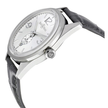 Silver-tone stainless steel case with a grey alligator leather strap. Fixed silver-tone stainless steel bezel. Silver dial with silver-tone hands and index hour markers. Arabic numerals mark the 3, 9 and 12 o'clock positions. minute markers around the outer rim. Dial Type: Analog. Luminescent hands and markers. Date display at the 6 o'clock position. Seconds sub-dial at the 6 o'clock position subdials. ETA Caliber 2894 automatic movement with a 40-hour power reserve. Scratch resistant sapphire crystal. Pull / push crown. Skeleton case back. Round case shape, case size: 41 mm, case thickness: 12 mm. Tang clasp. Water resistant at 100 meters / 330 feet. Functions: date, hour, minute, second. Vintage Series. Luxury watch style. Watch label: Swiss Made. Item Variations: BRG123 WH ST SCR, BRG123.WH.ST.SCR, BRG123WHSTSCR. Bell and Ross Vintage Officer Silver Dial GreyLeather Men's Watch BRG123-WH-ST-SCR.