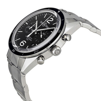 Stainless steel case with a stainless steel bracelet. Fixed stainless steel bezel. Black dial with luminous hands and index hour markers. Arabic numerals mark the 6 and 12 o'clock positions. Minute markers around the outer rim. Dial Type: Analog. Luminescent hands and markers. Date display between 4 and 5 o'clock positions. Chronograph - two sub-dials displaying: 60 second and 30 minute. Automatic movement. Scratch resistant sapphire crystal. Pull / push crown. Skeleton case back. Case diameter: 43 mm. Case thickness: 12 mm. Round case shape. Deployment clasp with push button release. Water resistant at 100 meters / 330 feet. Functions: chronograph, date, hour, minute, second. Luxury watch style. Watch label: Swiss Made. Bell and Ross Vintage Sport Black Chronograph Dial Automatic Men's Watch BRV126-BL-BE-SST.