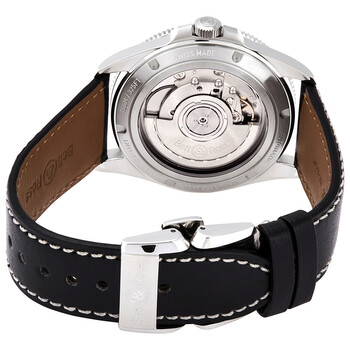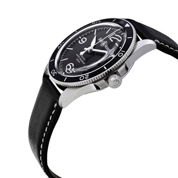 Stainless steel case with a black (calfskin) leather strap. Uni-directional rotating stainless steel bezel with a black aluminium (count-up elapsed time) top ring. Matte black dial with luminous silver-tone hands and index hour markers. Arabic numerals mark the 3, 6, 9 and 12 o'clock positions. Minute markers around the outer rim. Dial Type: Analog. Luminescent hands - superluminova. Date display between the 4 and 5 o'clock positions. Bell and Ross calibre BR-CAL.302 automatic movement, based upon Sellita SW300-1, containing 25 Jewels, bitting at 28800 vph, and has a power reserve of approximately 38 hours. Scratch resistant sapphire crystal. Screw down crown. Transparent case back. Round case shape. Case size: 41 mm. Fold over clasp. Water resistant at 100 meters / 330 feet. Functions: date, hour, minute, second. Vintage V2-92 Series. Luxury watch style. Watch label: Swiss Made. Bell and Ross Vintage V2-92 Automatic Matte Black Dial Men's Watch BRV292-BL-ST/SCA.
