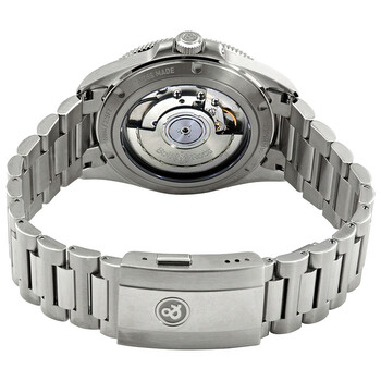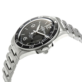 Stainless steel case with a stainless steel bracelet. Uni-directional rotating stainless steel with a black aluminium (count-up elapsed time) ring bezel. Matte black dial with luminous silver-tone hands and index hour markers. Arabic numerals mark the 3, 6, 9 and 12 o'clock positions. Minute markers around the outer rim. Dial Type: Analog. Luminescent hands - superluminova. Date display between the 4 and 5 o'clock positions. Bell and Ross calibre BR-CAL.302 automatic movement, based upon Sellita SW300-1, containing 25 Jewels, bitting at 28800 vph, and has a power reserve of approximately 38 hours. Scratch resistant sapphire crystal. Screw down crown. Transparent case back. Round case shape. Case size: 41 mm. Fold over clasp with a push button release. Water resistant at 100 meters / 330 feet. Functions: date, hour, minute, second. Vintage V2-92 Series. Luxury watch style. Watch label: Swiss Made. Bell and Ross Vintage V2-92 Automatic Matte Black Dial Men's Watch BRV292-BL-ST/SST.