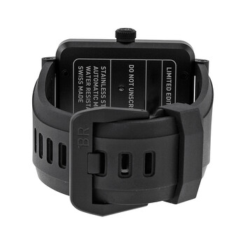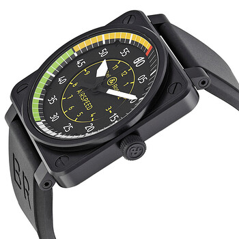 Black PVD stainless steel case with a black rubber strap. Fixed black PVD bezel. Black dial with luminous black hands and Arabic numeral hour markers. Arabic numeral minute markers (at 5 minute intervals). Minute markers around the outer rim. Dial Type: Analog. Luminescent hands and markers. Automatic movement with 42 hour power reserve. Scratch resistant sapphire crystal. Screw down crown. Solid case back. Case diameter: 46 mm. Case thickness: 10.5 mm. Square case shape. Tang clasp. Water resistant at 100 meters / 330 feet. Functions: hour, minute, second. Additional Info: supplied with an vas strap which is easily interchangeable. limited edition .. Luxury watch style. Bell Ross Aviation Flight Instruments Men's Watch BR0192-AIRSPEED.