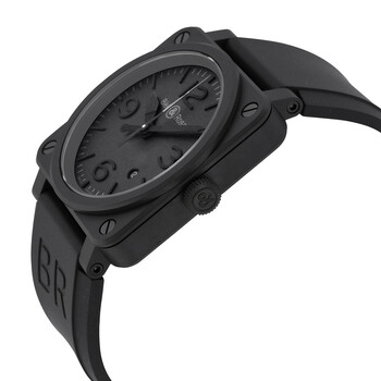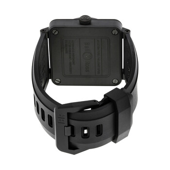 Black ceramic case with a black rubber strap. Fixed black ceramic bezel. Black dial with black hands and index hour markers. Arabic numerals mark the 3, 6, 9 and 12 o'clock positions. Minute markers around the outer rim. Dial Type: Analog. Luminescent hands. Date display between the 4 and 5 o'clock positions. Automatic movement with a 42-hour power reserve. Scratch resistant sapphire crystal. Solid case back. Case diameter: 42 mm. Case thickness: 9.8 mm. Square case shape. Strap width: 32 mm. Tang clasp. Water resistant at 100 meters / 330 feet. Functions: date, hour, minute, second. Additional Info: supplied with an additional black canvas strap. Dress watch style. Watch label: Swiss Made. Bell Ross Phantom Automatic Black Dial Black Rubber Men's Watch RBR0392-PHANTOM-CE.