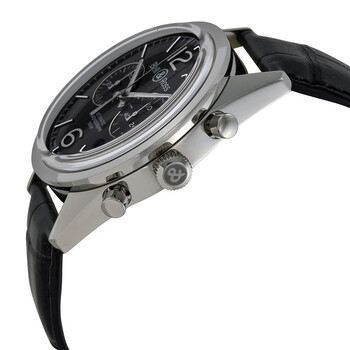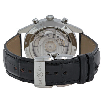 Stainless steel case with a black alligator leather strap. Fixed stainless steel bezel. Black dial with silver-tone hands and index hour markers. Arabic numerals mark the 6 and 12 o'clock positions. Minute markers around the outer rim. Dial Type: Analog. Date display between the 4 and 5 o'clock positions. Chronograph - two sub-dials displaying: 30 second and 60 minute. Automatic movement. Scratch resistant sapphire crystal. Pull / push crown. Skeleton case back. Case diameter: 41 mm. Round case shape. Fold over deployment clasp. Water resistant at 100 meters / 330 feet. Functions: chronograph, date, hour, minute, second. Casual watch style. Bell Ross Vintage Officer Automatic Chronograph Black Dial Black Leather Men's Watch RBRG126-BL-ST-SCR.