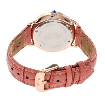 Rose gold-tone stainless steel case with a coral leather strap. Fixed rose gold-tone bezel. Coral dial with rose gold-tone hands and Arabic numeral hour markers. Dial Type: Analog. Quartz movement. Scratch resistant mineral crystal. Push / pull crown. Solid case back. Round case shape. Case size: 33 mm. Case thickness: 9 mm. Band width: 16 mm. Tang clasp. Water resistant at 50 meters / 165 feet. Functions: hour, minute, second. Casual watch style. Watch label: Swiss Movt. Item Variations: BTHBR6807. Bertha Abby Coral Dial Coral Leather Ladies Watch BR6807