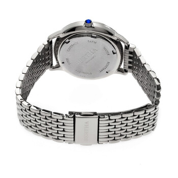 Stainless steel case with a stainless steel bracelet. Fixed stainless steel bezel. Silver dial with silver-tone hands and Arabic numeral hour markers. Dial Type: Analog. Quartz movement. Scratch resistant mineral crystal. Solid case back. Round case shape. Case size: 33 mm. Case thickness: 9 mm. Band width: 16 mm. Deployment clasp with a push button release. Water resistant at 50 meters / 165 feet. Functions: hour, minute. Casual watch style. Watch label: Swiss Movt. Item Variations: BTHBR6801. Bertha Abby Silver Dial Ladies Watch BR6801.