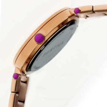 Rose gold-tone stainless steel case and bracelet. Fixed rose gold-tone bezel set with crystals. Black (multi-color chameleon) dial with rose gold-tone hands. A single crystal is set at the 12 o'clock position. Dial Type: Analog. Luminescent hands. Quartz movement. Scratch resistant mineral crystal. Pull / push crown. Solid case back. Round case shape. Case size: 38 mm. Case thickness: 10 mm. Band width: 20 mm. Deployment clasp with a push button release. Water resistant at 30 meters / 100 feet. Functions: hour, minute, second. Camilla Series. Dress watch style. Bertha Camilla Balck Chameleon Dial Gold-tone Ladies Watch BTHBR6203.