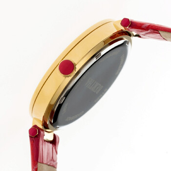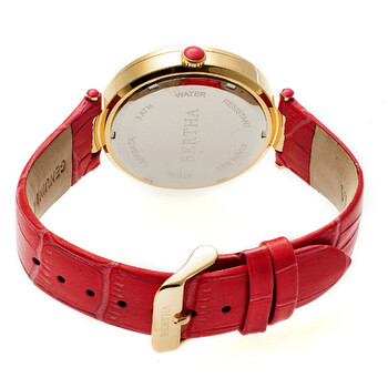 Gold-tone stainless steel case with a red leather strap. Fixed gold-tone bezel set with crystals. Black (chameleon) dial with gold-tone hands. A single diamond is set at the 12 o'clock position. Dial Type: Analog. Luminescent hands. Quartz movement. Scratch resistant mineral crystal. Pull / push crown. Solid case back. Round case shape. Case size: 38 mm. Case thickness: 10 mm. Band width: 20 mm. Tang clasp. Water resistant at 30 meters / 100 feet. Functions: hour, minute, second. Dress watch style. Bertha Camilla Crystal Black Chameleon Dial Ladies Watch BTHBR6205.