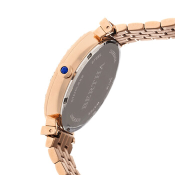 Rose gold-tone stainless steel case with a rose gold-tone stainless steel bracelet. Fixed gold-tone crystal set bezel. Multicolor dial with gold-tone Breguet-style shape hands and index hour markers. Dial Type: Analog. Luminescent hands. Quartz movement. Scratch resistant mineral crystal. Pull / push crown. Solid case back. Round case shape, case size: 37 mm, case thickness: 9 mm. Band width: 17 mm. Push button deployment clasp. Water resistant at 30 meters / 100 feet. Functions: hour, minute, second. Dress watch style. Watch label: Japan Movt. Item Variations: BTHBR7803. Bertha Emily Crystal Ladies Watch BR7803.