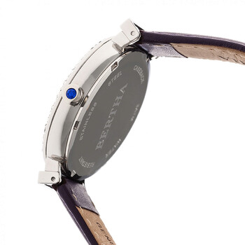 Silver-tone stainless steel case with a purple genuine leather strap. Fixed silver-tone crystal set bezel. Multicolor dial with silver-tone Breguet-style shape hands and index hour markers. Dial Type: Analog. Luminescent hands. Quartz movement. Scratch resistant mineral crystal. Pull / push crown. Solid case back. Round case shape, case size: 37 mm, case thickness: 9 mm. Band width: 18 mm. Buckle clasp. Water resistant at 30 meters / 100 feet. Functions: hour, minute, second. Dress watch style. Watch label: Japan Movt. Item Variations: BTHBR7805. Bertha Emily Crystal Ladies Watch BR7805.