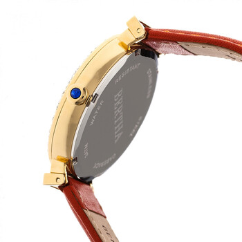 Gold-tone stainless steel case with a orange genuine leather strap. Fixed gold-tone crystal set bezel. Multicolor dial with gold-tone Breguet-style shape hands and index hour markers. Dial Type: Analog. Luminescent hands. Quartz movement. Scratch resistant mineral crystal. Pull / push crown. Solid case back. Round case shape, case size: 37 mm, case thickness: 9 mm. Band width: 18 mm. Buckle clasp. Water resistant at 30 meters / 100 feet. Functions: hour, minute, second. Dress watch style. Watch label: Japan Movt. Item Variations: BTHBR7806. Bertha Emily Crystal Ladies Watch BR7806.