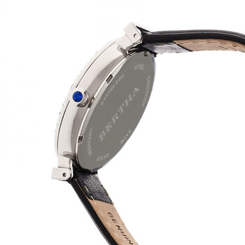 Silver-tone stainless steel case with a black leather strap. Fixed silver-tone stainless steel set with crystals bezel. Mother of pearl (humming bird) dial with silver-tone Breguet-style shape hands and index hour markers. Dial Type: Analog. Luminescent hands. Quartz movement. Scratch resistant mineral crystal. Pull / push crown. Solid case back. Round case shape, case size: 37 mm, case thickness: 9 mm. Band width: 18 mm. Tang clasp. Water resistant at 30 meters / 100 feet. Functions: hour, minute, second. Dress watch style. Watch label: Japan Movt. Item Variations: BTHBR7804. Bertha Emily Crystal Mother of Pearl Dial Ladies Watch BR7804.