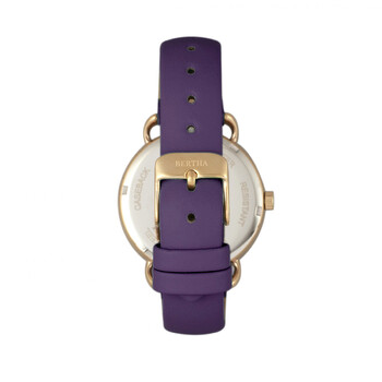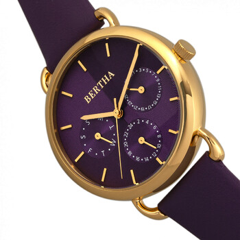 Gold-tone stainless steel case with a purple genuine leather strap. Fixed gold stainless steel bezel. Purple dial with gold-tone hands and index hour markers. Dial Type: Analog. Date display at the 3 o'clock position. Three - date, day, 24 hour subdials. Quartz movement. Scratch resistant mineral crystal. Pull / push crown. Solid case back. Round case shape, case size: 36 mm, case thickness: 10 mm. Band width: 16 mm. Buckle clasp. Water resistant at 30 meters / 100 feet. Functions: date, day, GMT, second time zone, hour, minute, second. Casual watch style. Watch label: Japan Movt. Item Variations: BTHBR8305. Bertha Gwen Purple Dial Ladies Watch BR8305.