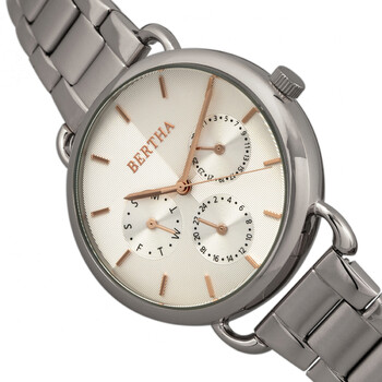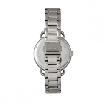 Silver-tone stainless steel case with a silver-tone stainless steel bracelet. Fixed silver-tone stainless steel bezel. Silver-tone dial with gold-tone hands. Dial Type: Analog. Date display at the 3 o'clock position. Quartz movement. Scratch resistant mineral crystal. Pull / push crown. Solid case back. Round case shape, case size: 36 mm, case thickness: 10 mm. Band width: 16 mm. Fold over push button deployment clasp. Water resistant at 30 meters / 100 feet. Functions: date, day, GMT, second time zone, hour, minute, second. Casual watch style. Watch label: Japan Movt. Item Variations: BTHBR8301. Bertha Gwen Silver Dial Ladies Watch BR8301.