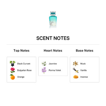Elegance opens with a refreshing burst of black currant, juicy orange, and the romantic touch of Bulgarian rose. As the fragrance unfolds, the heart reveals a soft bouquet of jasmine and Parma violet, creating a graceful and feminine aura. The base finishes with smooth musk, creamy vanilla, and a whisper of incense, leaving a lasting impression that’s both alluring and refined.
