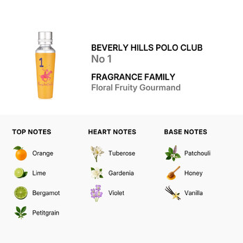 Crafted by the iconic American fashion brand, Beverly Hills Polo Club, No 1 opens with a refreshing burst of orange, lime, bergamot, and petitgrain. These zesty top notes awaken the senses and set the stage for a lush floral heart. Tuberose, gardenia, and violet unfold at the center, adding a soft, romantic touch that feels effortlessly feminine.