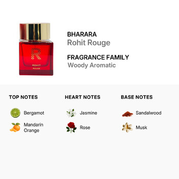Rohit Rouge opens with the fresh and invigorating scents of bergamot and pineapple, instantly uplifting your mood. As the fragrance evolves, the heart reveals a rich combination of juniper berry and blackcurrant, adding a touch of fruity elegance. The base notes of cedarwood, vetiver, patchouli, moss, and musk provide a warm, earthy foundation that lingers long after application.