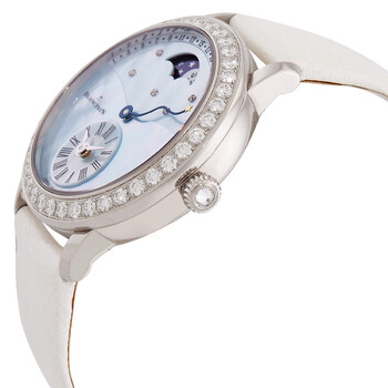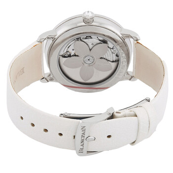18kt white gold case with a white ostrich leather strap. Fixed 18kt white gold bezel with diamond set. White mother of pearl dial with silver-tone hands and Roman numeral hour markers. Dial Type: Analog. Pointer date. One subdial displaying: moonphase. Blancpain Calibre 2650RL Automatic movement, containing 32 Jewels, composed of 302 parts, and has a power reserve of approximately 65 hours. Scratch resistant sapphire crystal. Skeleton transparent exhibition see through case back. Round case shape, case size: 36 mm, case thickness: 10.75 mm. Band width: 18 mm. Water resistant at 30 meters / 100 feet. Functions: date, hour, minute, moonphase, retrograde. Luxury watch style. Watch label: Swiss Made. Blancpain Automatic Ladies Watch 3653-1954L-58B.