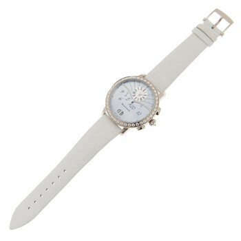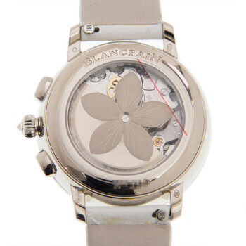 18kt white gold case with a white ostrich leather strap. Fixed bezel with diamond set. Blue mother of pearl dial with silver-tone hands and Roman numeral hour markers. Dial Type: Analog. Date display at the 6 o'clock position. Chronograph - two sub-dials displaying: 30 minute and 12 hour. Blancpain Calibre 26F8G Automatic movement, containing 44 Jewels, composed of 495 parts, bitting at 21600 vph, and has a power reserve of approximately 40 hours. Scratch resistant sapphire crystal. Skeleton transparent exhibition see through case back. Round case shape, case size: 38.6 mm, case thickness: 13.1 mm. Tang clasp. Water resistant at 30 meters / 100 feet. Functions: chronograph, column wheel, flyback, big date, hour, minute, second. Additional Info: bezel set with 40 diamonds. Luxury watch style. Watch label: Swiss Made. Blancpain Chronograph Automatic Ladies Watch 3626-1954L-58A.