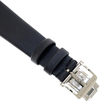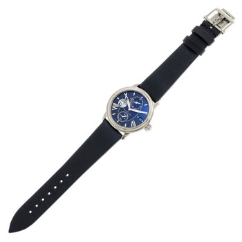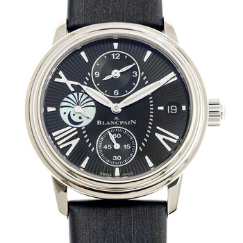 Silver-tone stainless steel case with a black satin strap. Fixed silver-tone stainless steel bezel. Black dial with silver-tone hands and index-Roman numeral hour markers. Dial Type: Analog. Luminescent hands. Date display at the 3 o'clock position. Three sub-dials displaying: 60 second, 12 hour, day/night indicator. Blancpain Calibre 5L60 Automatic movement, containing 30 Jewels, composed of 253 parts, bitting at 21600 vph, and has a power reserve of approximately 100 hours. Scratch resistant sapphire crystal. Solid case back. Round case shape, case size: 34 mm, case thickness: 10.4 mm. Band width: 18 mm. Water resistant at 100 meters / 330 feet. Functions: date, second time zone, hour, minute, second, day/night indicator. Double Time Zone Series. Luxury watch style. Watch label: Swiss Made. Blancpain Double Time Zone Automatic Ladies Watch 3760-1130-52B.