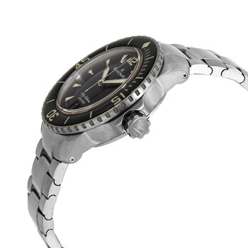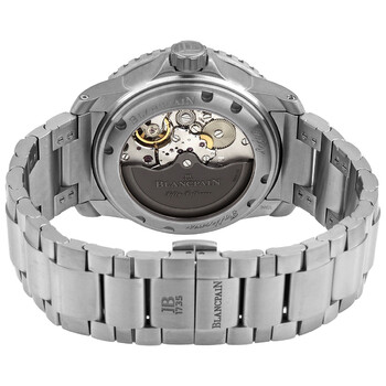 Grey titanium case with a grey titanium bracelet. Uni-directional rotating grey titanium bezel with a black sapphire ring. Black dial with luminous silver-tone hands and index hour markers. Minute markers around the outer rim. Dial Type: Analog. Luminescent hands and markers. Date display at the 3 o'clock position. Blancpain calibre 6918B automatic movement, containing 44 Jewels, bitting at 28800 vph, and has a power reserve of approximately 120 hours. Scratch resistant sapphire crystal. Screw down crown. Transparent case back. Round case shape. Case size: 45 mm. Case thickness: 16.2 mm. Band width: 23 mm. Fold over clasp. Water resistant at 300 meters / 1000 feet. Functions: date, hour, minute, second. Fifty Fathoms Series. Luxury watch style. Watch label: Swiss Made. Blancpain Fifty Fathoms Automatic Black Dial Men's Watch 5050 12B30 98B.