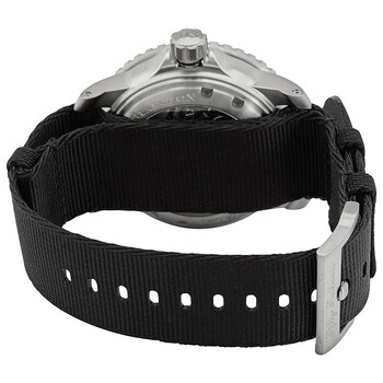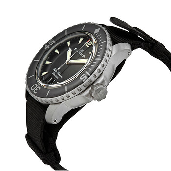 Grey titanium case with a black NATO canvas strap. Uni-directional rotating diving scale titanium bezel with a black count-up elapsed time top ring. Black dial with silver-tone hands and Arabic numeral and index hour markers. Minute markers around the outer rim. Dial Type: Analog. Luminescent hands and markers. Date display at the 6 o'clock position. Blancpain Calibre 6918B Automatic movement, containing 44 Jewels, bitting at 28800 vph, and has a power reserve of approximately 120 hours. Scratch resistant sapphire crystal. Screw down crown. Transparent case back. Round case shape, case size: 45 mm, case thickness: 16.20 mm. Band width: 23 mm. Buckle clasp. Water resistant at 300 meters / 1000 feet. Functions: big date, hour, minute, second. Fifty Fathoms Series. Dive watch style. Watch label: Swiss Made. Blancpain Fifty Fathoms Automatic Black Dial Men's Watch 5050 12B30 NABA.
