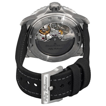 Grey titanium case with a black canvas strap. Fixed grey titanium bezel with an inlaid sapphire inlay. Black dial with luminous silver-tone hands and index hour markers. Minute markers around the outer rim. Dial Type: Analog. Luminescent hands and markers. Date display between the 4 and 5 o'clock positions. Blancpain calibre 6918B automatic movement, containing 44 Jewels, bitting at 28800 vph, and has a power reserve of approximately 120 hours. Scratch resistant sapphire crystal. Screw down crown. Transparent case back. Round case shape. Case size: 45 mm. Case thickness: 16.25 mm. Band width: 23 mm. Tang clasp. Water resistant at 300 meters / 1000 feet. Functions: big date, hour, minute, second. Fifty Fathoms Series. Dive watch style. Watch label: Swiss Made. Blancpain Fifty Fathoms Automatic Black Dial Unisex Watch 5015-12b30-b52a.