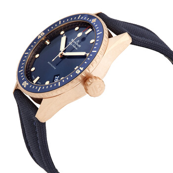 18kt rose gold case with a blue canvas strap. Uni-directional rotating 18kt rose gold bezel with a blue ceramic ring. Blue dial with luminous rose gold-tone hands and dot hour markers. Minute markers around the outer rim. Dial Type: Analog. Luminescent hands and markers. Date display between the 4 and 5 o'clock positions. Blancpain calibre 1315 automatic movement, containing 35 Jewels, composed of 227 parts, and has a power reserve of approximately 120 hours. Scratch resistant sapphire crystal. Screw down crown. Transparent case back. Round case shape. Case size: 43 mm. Case thickness: 13.4 mm. Band width: 23 mm. Tang clasp. Water resistant at 30 meters / 100 feet. Functions: date, hour, minute, second. Fifty Fathoms Series. Luxury watch style. Watch label: Swiss Made. Blancpain Fifty Fathoms Automatic Blue Dial Men's Watch 5000-36S40-O52A.
