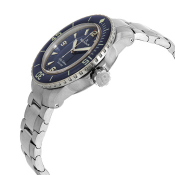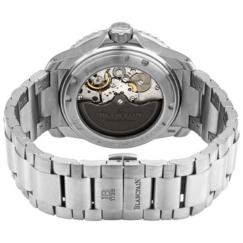 Grey titanium case with a grey titanium bracelet. Uni-directional rotating grey titanium bezel with a blue sapphire ring. Blue dial with luminous silver-tone hands and index hour markers. Arabic numerals appear at the 3, 6, 9 and 12 o'clock positions. Minute markers around the outer rim. Dial Type: Analog. Luminescent hands and markers. Date display between the 4 and 5 o'clock positions. Blancpain calibre 1315 automatic movement, containing 35 Jewels, composed of 227 parts, and has a power reserve of approximately 120 hours. Scratch resistant sapphire crystal. Screw down crown. Transparent case back. Round case shape. Case size: 45 mm. Case thickness: 15.4 mm. Band width: 23 mm. Fold over clasp. Water resistant at 300 meters / 1000 feet. Functions: date, hour, minute, second. Additional Info: anti-magnetic case. Fifty Fathoms Series. Luxury watch style. Watch label: Swiss Made. Blancpain Fifty Fathoms Automatic Blue Dial Men's Watch 5015 12B40 98.