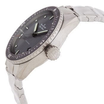 Grey titanium case and bracelet. Uni-directional rotating grey titanium bezel. Grey dial with silver-tone hands and index hour markers. Minute markers around the outer rim. Dial Type: Analog. Luminescent hands and markers. Date display between 4 and 5 o'clock position. Blancpain Calibre 1315 Automatic movement, containing 35 Jewels, composed of 227 parts, and has a power reserve of approximately 120 hours. Scratch resistant sapphire crystal. Transparent see through case back. Round case shape, case size: 43 mm. Fold over clasp. Water resistant at 300 meters / 1000 feet. Functions: date, hour, minute, second. Additional Info: original box, manual (complete accessories). Fifty Fathoms Series. Luxury watch style. Watch label: Swiss Made. Blancpain Fifty Fathoms Automatic Grey Dial Men's Watch 5000 1210 98S.
