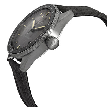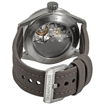 Grey titanium case with a grey canvas strap. Uni-directional rotating grey titanium bezel with a black ceramic insert. Grey dial with luminous black hands and index hour markers. Minute markers around the outer rim. Dial Type: Analog. Luminescent hands and markers. Date display between the 4 and 5 o'clock positions. Blancpain calibre 1315DD automatic movement, containing 37 Jewels, bitting at 28800 vph, and has a power reserve of approximately 120 hours. Scratch resistant sapphire crystal. Screw down crown. Transparent case back. Round case shape. Case size: 43 mm. Case thickness: 13.45 mm. Band width: 23 mm. Tang clasp. Water resistant at 30 meters / 100 feet. Functions: date, day, hour, minute, second. Fifty Fathoms Series. Dress watch style. Watch label: Swiss Made. Blancpain Fifty Fathoms Automatic Grey Dial Men's Watch 5000 1210 G52A.