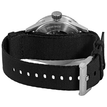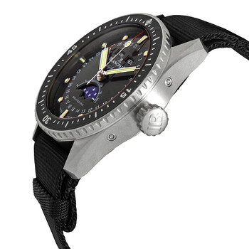 Stainless steel case with a black fabric strap. Uni-directional rotating stainless steel bezel with an inlaid black ceramic fill Grey dial with luminous silver-tone hands and dot hour markers. Date scale around an inner ring. Minute markers around the outer rim. Dial Type: Analog. Luminescent hands and markers. Complete calendar. Day of the week and month display above central dial. Moonphase display. Blancpain calibre 6654.P automatic movement, containing 28 Jewels, bitting at 28800 vph, and has a power reserve of approximately 72 hours. Scratch resistant sapphire crystal. Screw down crown. Transparent case back. Round case shape. Case size: 43 mm. Case thickness: 13.46 mm. Tang clasp. Water resistant at 300 meters / 1000 feet. Functions: full calendar, moon phase, date, day, hour, minute, second. Fifty Fathoms Series. Dive watch style. Watch label: Swiss Made. Blancpain Fifty Fathoms Bathyscaphe Automatic Grey Dial Watch 5054-1110-naba.