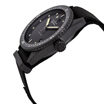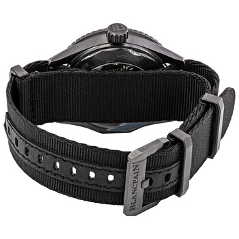 Black ceramic case with a black fabric NATO strap. Uni-directional rotating coin edge black count-up elapsed time ceramic bezel. Black dial with luminous grey hands and dot hour markers. Minute markers around the outer rim. Dial Type: Analog. Luminescent hands and markers. Date display between the 4 and 5 o'clock positions. Blancpain Calibre 1315 Automatic movement, containing 35 Jewels, composed of 227 parts, and has a power reserve of approximately 120 hours. Scratch resistant sapphire crystal. Screw down crown. Transparent case back. Round case shape, case size: 43 mm, case thickness: 13.4 mm. Band width: 22 mm. Tang clasp. Water resistant at 300 meters / 1000 feet. Functions: date, hour, minute, second. Fifty Fathoms Series. Luxury watch style. Watch label: Swiss Made. Blancpain Fifty Fathoms Automatic Men's Watch 5000-0130-NABA.