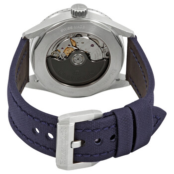 Stainless steel case with a blue textile (rubber backed) strap. Uni-directional rotating coin edge stainless steel bezel with a blue ceramic (count-up elapsed time) top ring. Blue dial with luminous grey hands and dot hour markers. Minute markers around the outer rim. Dial Type: Analog. Luminescent hands and markers. Date display between the 4 and 5 o'clock positions. Blancpain calibre 1150 automatic movement, containing 28 Jewels, composed of 210 parts, bitting at 21600 vph, and has a power reserve of approximately 100 hours. Scratch resistant sapphire crystal. Screw down crown. Transparent case back. Round case shape. Case size: 38 mm. Case thickness: 11 mm. Band width: 20 mm. Tang clasp. Water resistant at 300 meters / 1000 feet. Functions: date, hour, minute, second. Fifty Fathoms Bathyscaphe Series. Luxury watch style. Watch label: Swiss Made. Blancpain Fifty Fathoms Bathyscaphe Automatic Blue Dial Men's Watch 5100-1140-O52A.